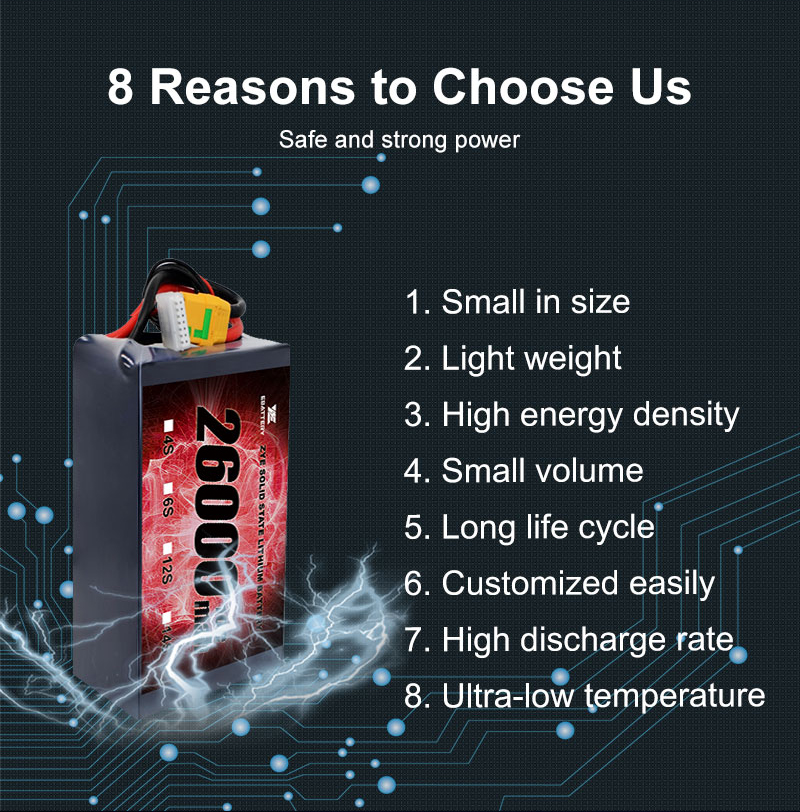Τεχνολογία αιχμής: Οι μπαταρίες στερεάς κατάστασης αντιπροσωπεύουν τις τελευταίες εξελίξεις στην τεχνολογία μπαταριών, προσφέροντας ανώτερες επιδόσεις και ασφάλεια, συμπεριλαμβανομένηςΥψηλή ενεργειακή πυκνότητα 22Ah 20Ah 22000mAh 10C 20C Συσκευασία μπαταρίας ιόντων στερεάς κατάστασης για αεροσκάφη μεγάλης εμβέλειας.